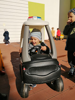 Na placu zabaw czekała nas niespodzianka. Dzieci mogły pojeżdzić samochodami i motorem. Zabawa super, choć niektórym trudno było doczekać się swojej kolejki